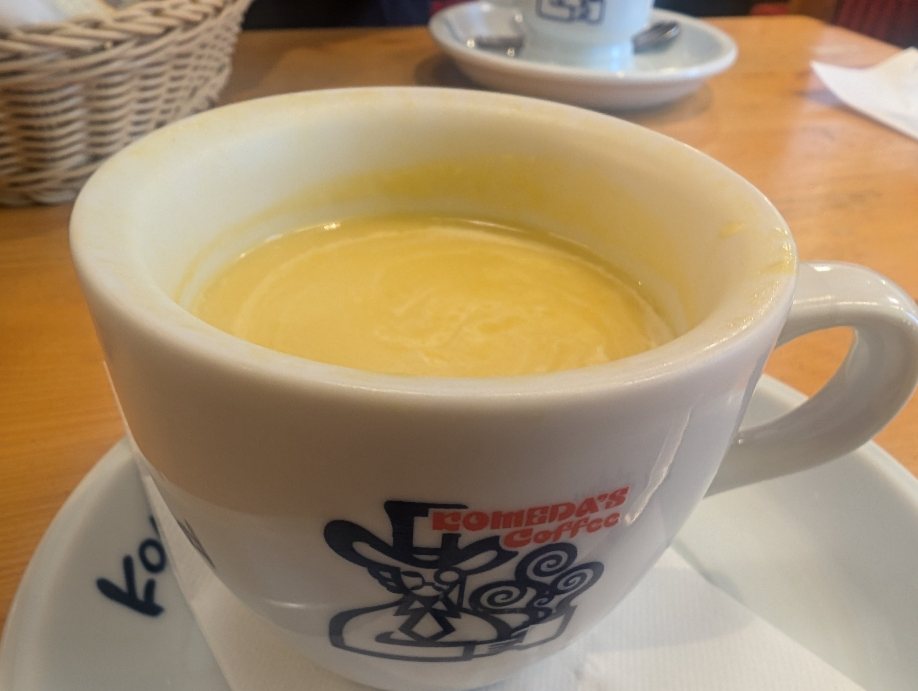 いつも激混みなので平日の昼過ぎに行きました。お団子ころころできるの楽しい🫶・コメダのコーンポタージュ